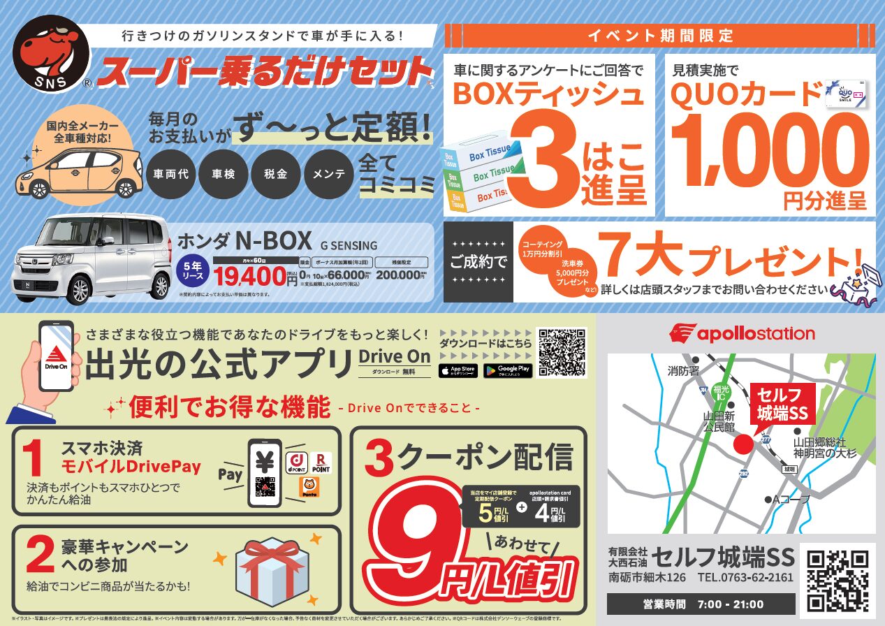 ・当日限定の大特価で給油できます ・20L以上の給油でBOXティッシュ5箱プレゼント ・お子さまにはお菓子をプレゼント