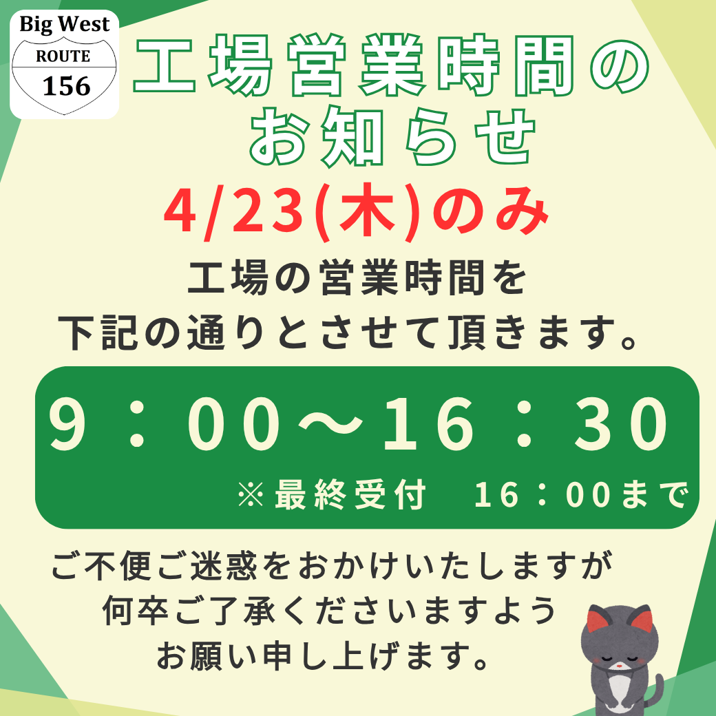 4/23のみ工場の営業時間の短縮になります。