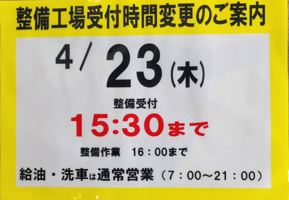 23日 整備工場受付は15時30分、